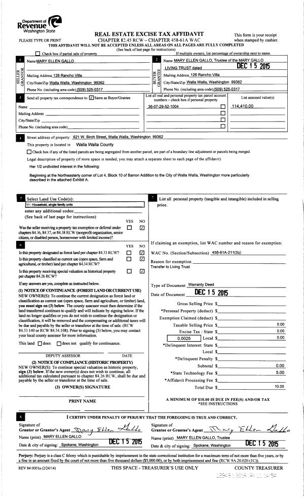 | 1 | 12/15/2015 | WARRANTY D | WARRANTY DEED | GALLO GENE | GALLO GENE | | | $0.00 | 129491 | 2016-00227 |