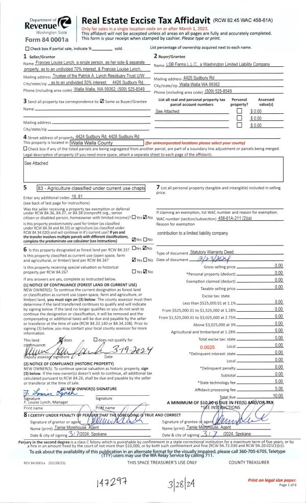 | 1 | 03/28/2024 | WARRANTY D | WARRANTY DEED | LYNCH FRANCES LOUISE | LSB FARMS LLC | | | | 147297 | 2024-01510 |