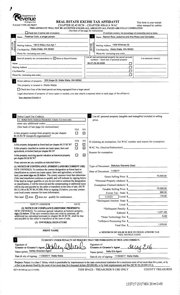| 1 | 11/30/2017 | SWD | STATUTORY WARRANTY DEED | COLIN FIDELMAR | LEDEZMA RAMON RUIZ | | | $70,000.00 | 133717 | 2017-09599 |
