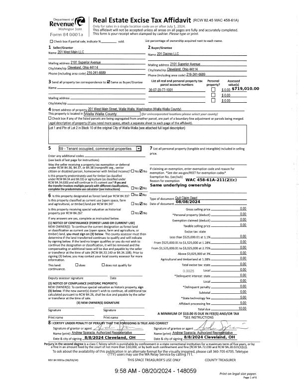 | 1 | 08/26/2024 | QCD | QUIT CLAIM DEED | 201 WEST MAIN LLC | 201 DACRES LLC | | | | 148059 | 2024-04741 |