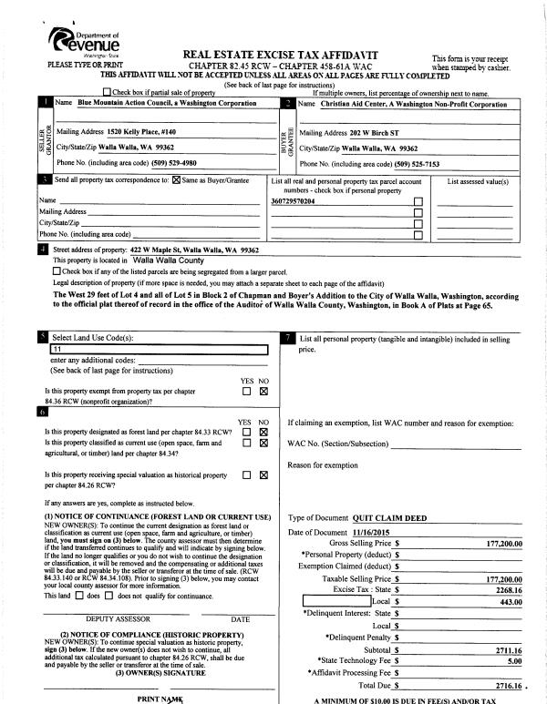 | 1 | 11/16/2015 | QCD | QUIT CLAIM DEED | BLUE MOUNTAIN ACTION COUNCIL | CHRISTIAN AID CENTER | | | $177,200.00 | 129222 | 2015-10040 |