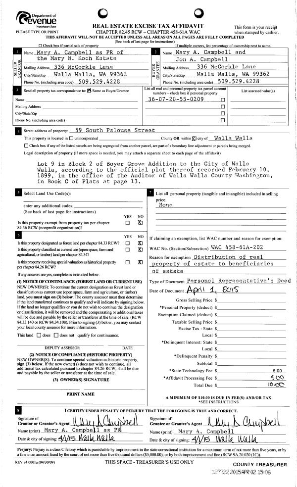 | 1 | 04/01/2015 | DPR | DEED OF PERSONAL REPRESENTATIVE | KOCH MARY N | CAMPBELL JON A & MARY A | | | $0.00 | 127722 | 2015-02725 |