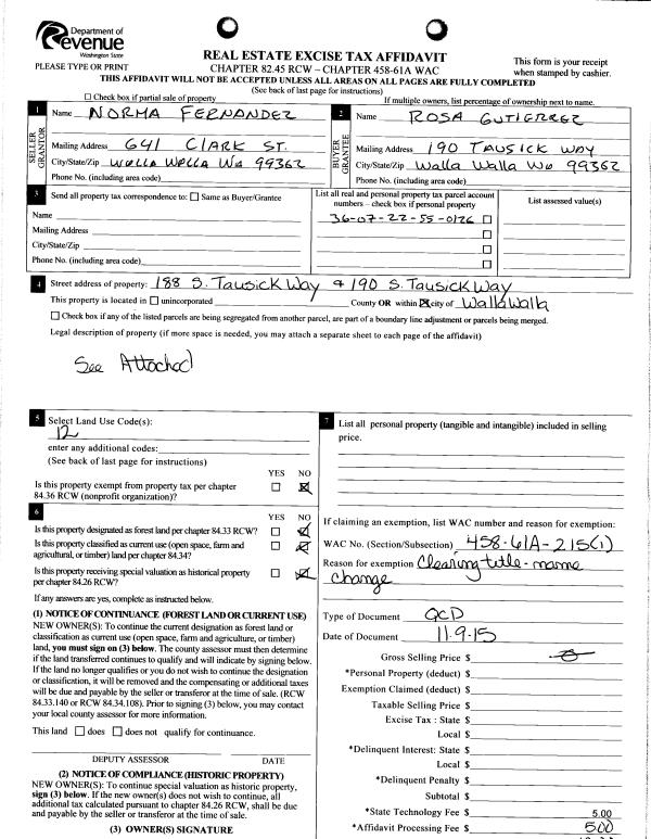 | 1 | 11/09/2015 | QCD | QUIT CLAIM DEED | FERNANDEZ NORMA R | GUTIERREZ ROSA | | | | 129173 | 2015-09814 |