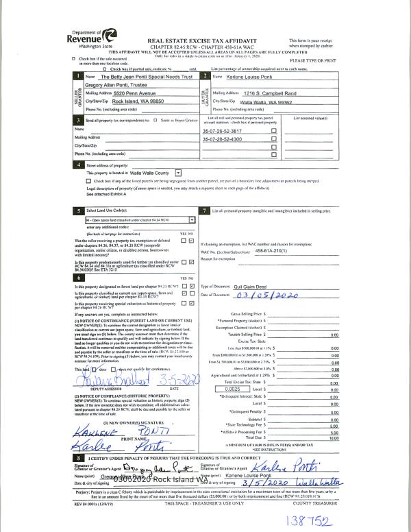 | 1 | 03/05/2020 | QCD | QUIT CLAIM DEED | PONTI BETTY JEAN | PONTI KARLENE LOUISE | | | $0.00 | 138752 | 2020-02085 |