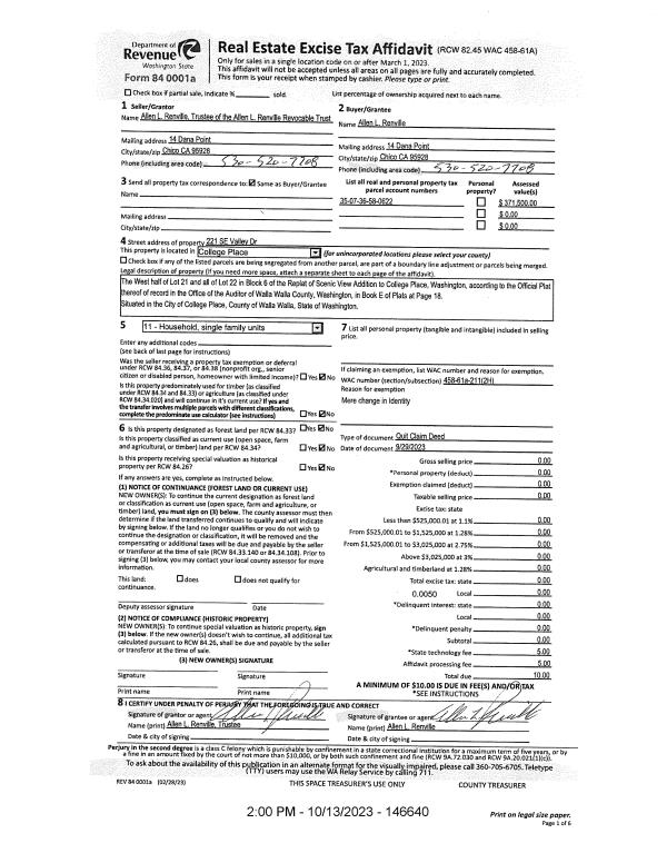 | 1 | 10/13/2023 | QCD | QUIT CLAIM DEED | RENVILLE ALLEN L REVOCABLE TRUST | RENVILLE ALLEN L | | | | 146640 | 2023-06049 |