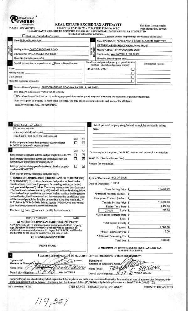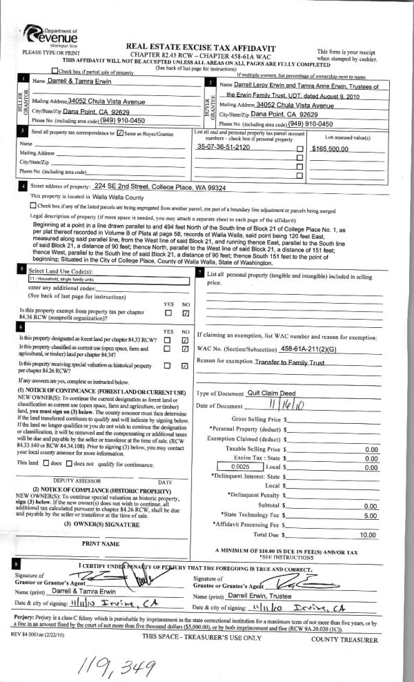 | 3 | 11/18/2010 | QCD | QUIT CLAIM DEED | ERWIN, DARRELL & TAMRA | ERWIN FAMILY TRUST | | | | 119349 | 2010-09467 |