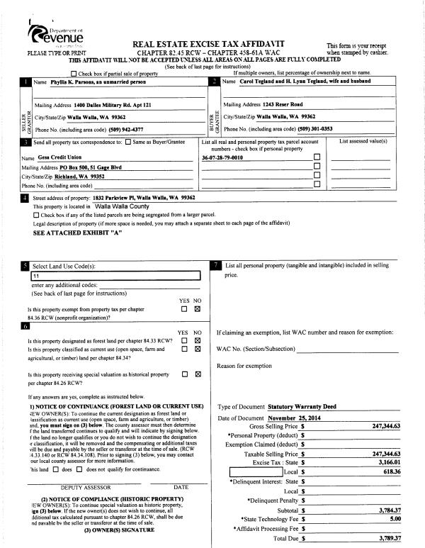 | 2 | 12/01/2014 | SWD | STATUTORY WARRANTY DEED | PARSONS PHYLLIS K | TEGLAND H LYNN & CAROL | | | $247,345.00 | 127036 | 2014-08697 |