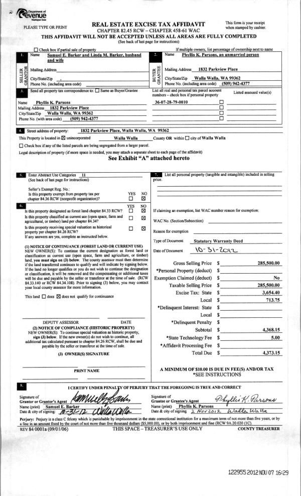 | 3 | 11/07/2012 | WARRANTY D | WARRANTY DEED | BARKER, SAMUEL E & LINDA M | PARSONS, PHYLLIS K | | | $285,500.00 | 122955 | 2012-09887 |