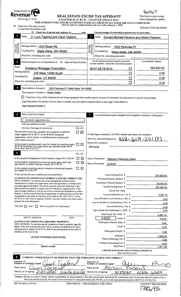 | 1 | 02/25/2020 | SWD | STATUTORY WARRANTY DEED | TEGLAND H LYNN & CAROL | PARSONS DONALD M & ALLISON M | | | $207,922.00 | 138695 | 2020-01770 |