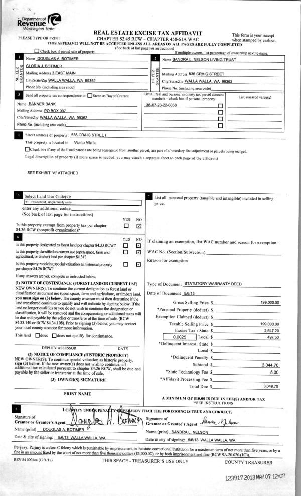 | 3 | 05/07/2013 | WARRANTY D | WARRANTY DEED | BOTIMER, DOUGLAS A & GLORIA | NELSON, SANDRA L | | | $199,000.00 | 123917 | 2013-04545 |