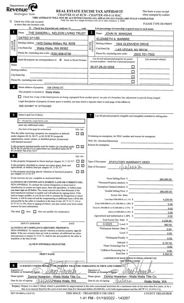 | 2 | 01/19/2022 | SWD | STATUTORY WARRANTY DEED | SANDRA L NELSON LIVING TRUST | MANGAN JOHN W & ELIZABETH A BARBRE | | | $385,000.00 | 143267 | 2022-00590 |