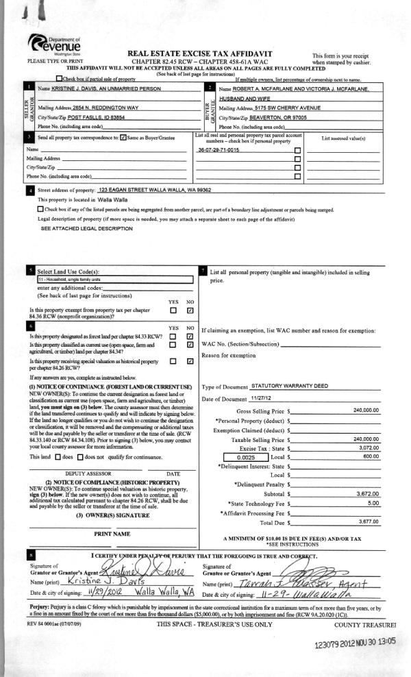 | 1 | 11/30/2012 | WARRANTY D | WARRANTY DEED | DAVIS, KRISTINE J | MC FARLANE, ROBERT A & VICTORI | | | $240,000.00 | 123079 | 2012-10614 |