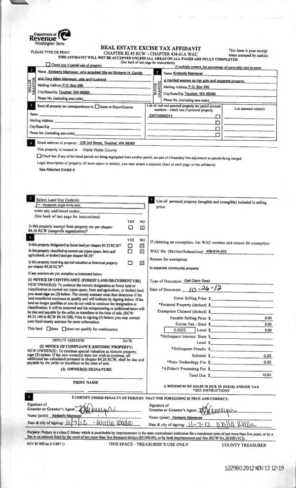 | 1 | 11/13/2012 | QCD | QUIT CLAIM DEED | CONDE, KIMBERLY H (NOW NIEMEYE | NIEMEYER, KIMBERLY | | | $0.00 | 122980 | 2012-09999 |