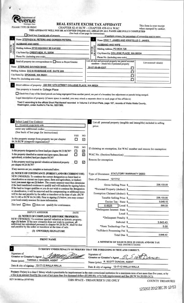 | 1 | 12/20/2012 | WARRANTY D | WARRANTY DEED | PETERS, STEPHEN & DOREEN | JAMES, ERIC T & KRISTELLE C | | | $238,133.00 | 123202 | 2012-11374 |