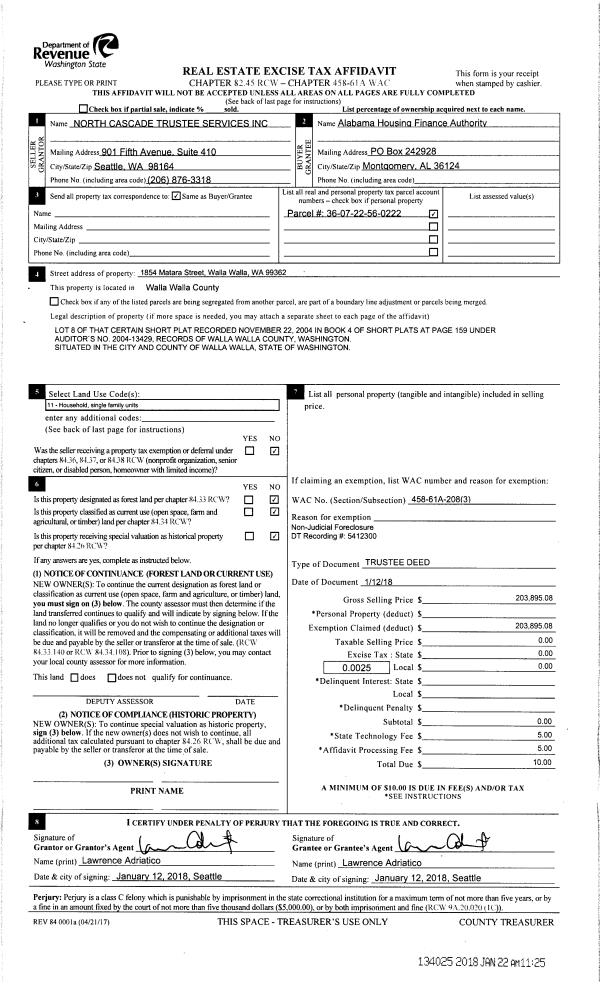 | 5 | 01/22/2018 | TRUSTEES D | TRUSTEE'S DEED | KILIONA WILLIE S & FAANIMO | ALABAMA HOUSING FINANCE AUTHORITY | | | $203,895.00 | 134025 | 2018-00562 |