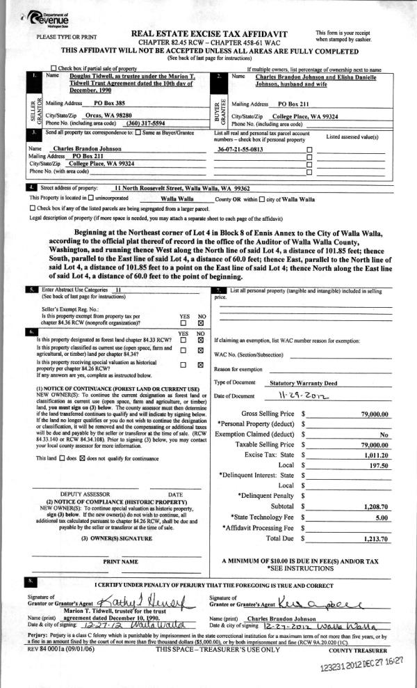 | 2 | 12/27/2012 | WARRANTY D | WARRANTY DEED | TIDWELL, MARION T | JOHNSON, CHARLES BRANDON | | | $79,000.00 | 123231 | 2012-11584 |