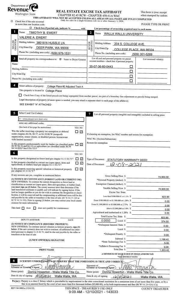 | 1 | 12/10/2021 | SWD | STATUTORY WARRANTY DEED | EWERT TIMOTHY B & VALERIE A | WALLA WALLA UNIVERSITY | | | $74,900.00 | 143033 | 2021-14528 |