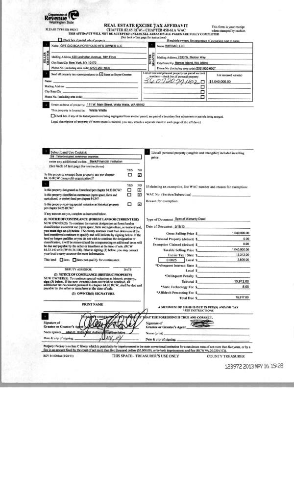 | 4 | 05/16/2013 | SWP | Special Warranty Deed | GPT GIG BOA PORTFOLIO HFS OWNE | WW BAC LLC | | | $1,040,000.00 | 123972 | 2013-04916 |