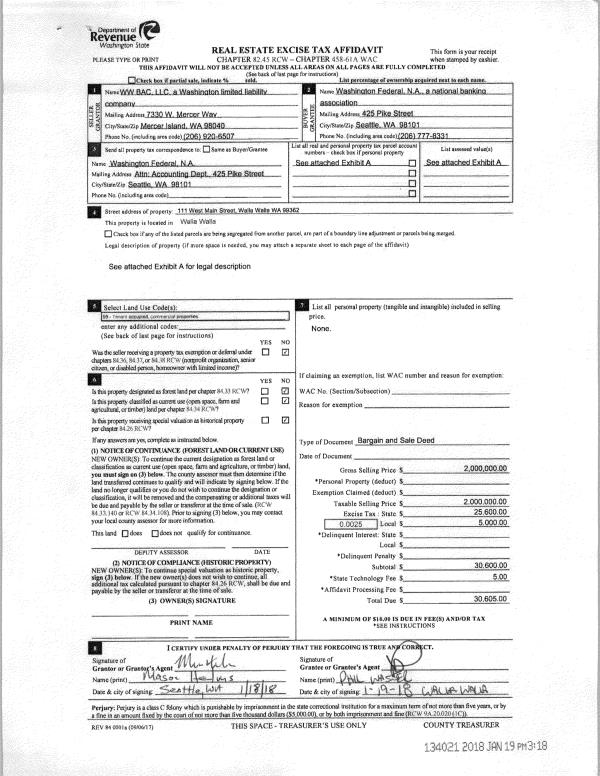 | 2 | 01/19/2018 | BARGAIN & | BARGAIN & SALE DEED | WW BAC LLC | WASHINGTON FEDERAL NA | | 12-PARCELS | $2,000,000.00 | 134021 | 2018-00552 |