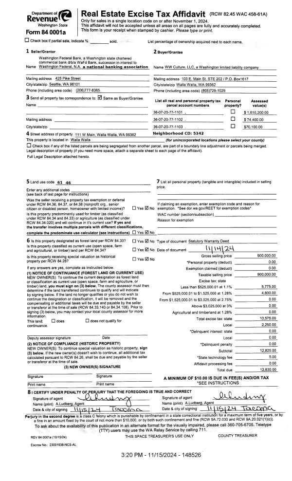 | 1 | 11/18/2024 | SWD | STATUTORY WARRANTY DEED | WASHINGTON FEDERAL NA | WW CULTURE LLC | | 3-PARCELS | $900,000.00 | 148526 | 2024-06670 |