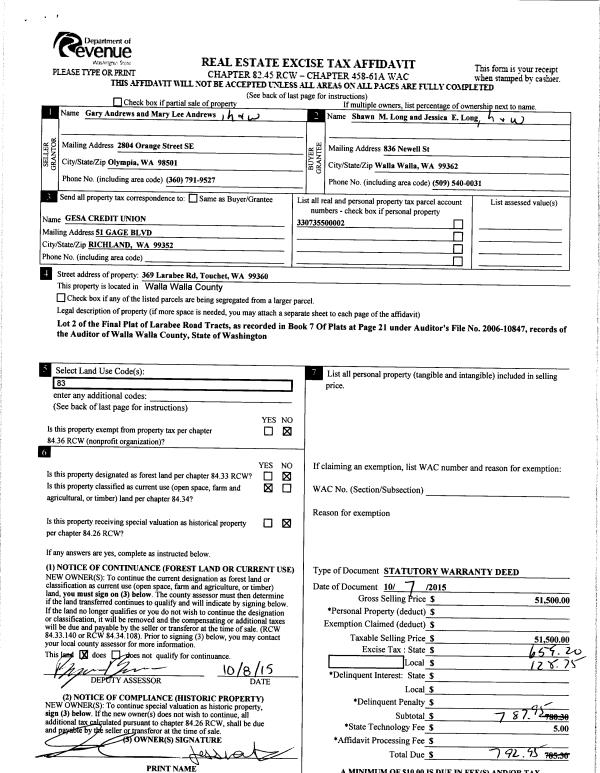 | 1 | 10/08/2015 | SWD | STATUTORY WARRANTY DEED | ANDREWS GARY & MARY LEE | LONG SHAWN M & JESSICA E | | | $51,500.00 | 128970 | 2015-08890 |