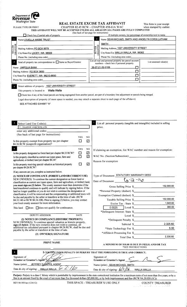 | 2 | 06/03/2016 | SWD | STATUTORY WARRANTY DEED | WIEBE LOUELLA I TRUST | SMITH SEAN MICHAEL | | | $152,000.00 | 130346 | 2016-04181 |