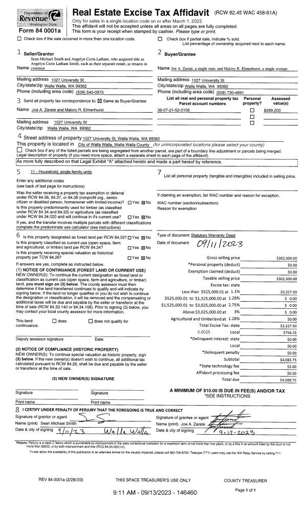 | 1 | 09/13/2023 | SWD | STATUTORY WARRANTY DEED | SMITH SEAN MICHAEL | ZARATE JOE A | | | $302,500.00 | 146460 | 2023-05322 |