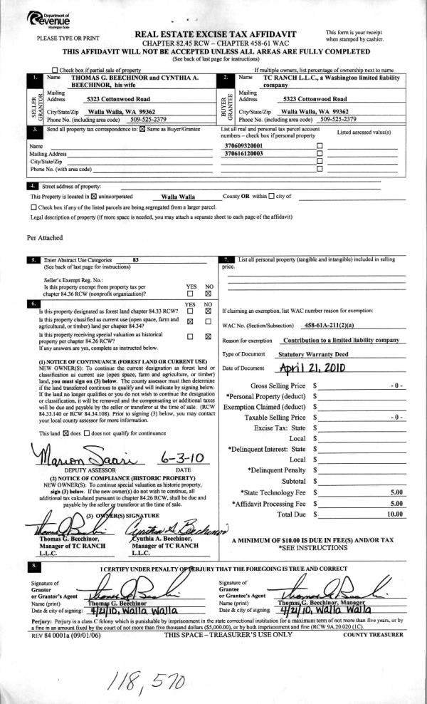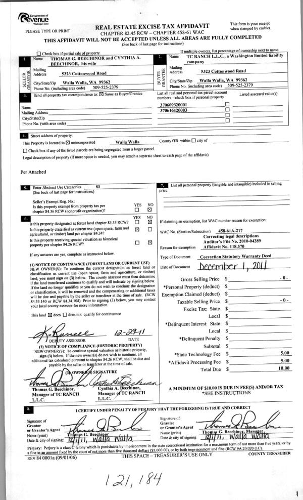 | 5 | 12/29/2011 | WARRANTY D | WARRANTY DEED | BEECHINOR THOMAS | TC RANCH LLC | | | | 121184 | 2011-10271 |