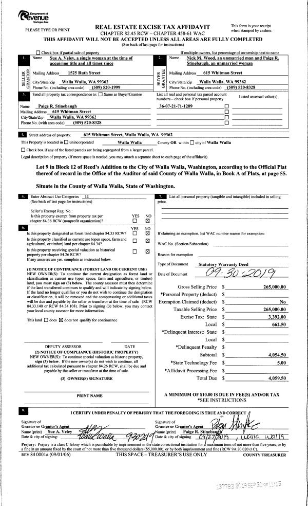 | 2 | 09/30/2019 | SWD | STATUTORY WARRANTY DEED | VELEY SUE A | WOOD NICK M | | | $265,000.00 | 137783 | 2019-07699 |