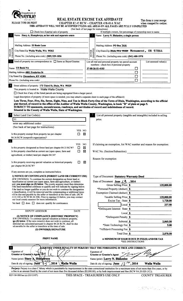 | 1 | 06/16/2014 | SWD | STATUTORY WARRANTY DEED | HUMPHREYS STACY A | BLAKESLEE LARRY | | | $135,000.00 | 126074 | 2014-04129 |