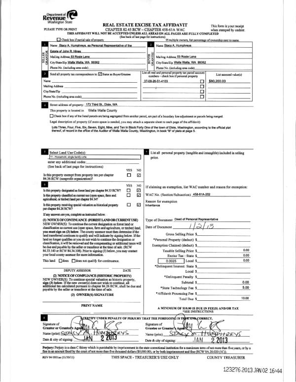 | 2 | 01/02/2013 | WARRANTY D | WARRANTY DEED | HINES, JOHN R ESTATE OF | HUMPHREYS, STACY A | | | $0.00 | 123276 | 2013-00054 |