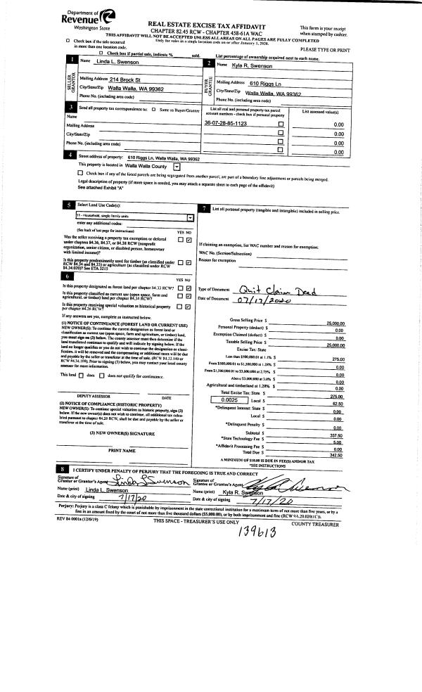 | 1 | 07/31/2020 | QCD | QUIT CLAIM DEED | SWENSON LINDA L | SWENSON KYLA R | | | $25,000.00 | 139613 | 2020-07427 |