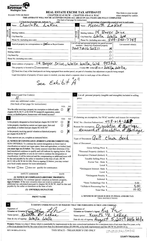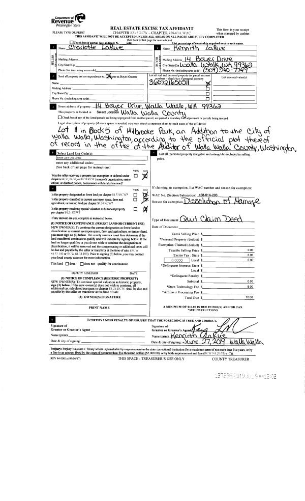 | 2 | 06/27/2019 | QCD | QUIT CLAIM DEED | LA RUE KENNITH R & CHARLOTTE | LA RUE KENNITH R | | | $0.00 | 137236 | 2019-04926 |
