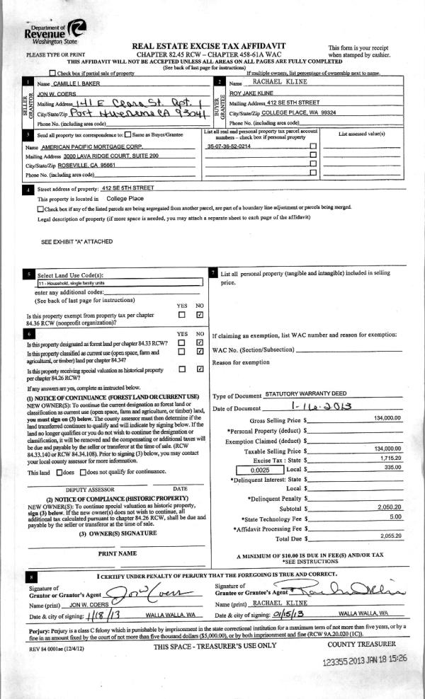 | 2 | 01/18/2013 | WARRANTY D | WARRANTY DEED | COERS, JON W & CAMILLE I | KLINE, ROY JAKE & RACHAEL | | | $134,000.00 | 123355 | 2013-00582 |