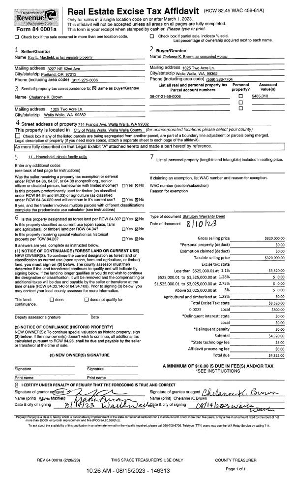 | 1 | 08/15/2023 | SWD | STATUTORY WARRANTY DEED | MAXFIELD KAY L | BROWN CHELANNE K | | | $320,000.00 | 146313 | 2023-04691 |