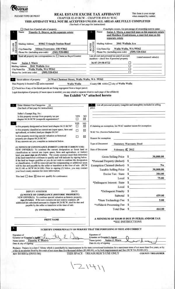 | 5 | 02/17/2012 | WARRANTY D | WARRANTY DEED | DESEVE, TIMOTHY | MURO, ISAIAS J | | | $30,000.00 | 121411 | 2012-01387 |