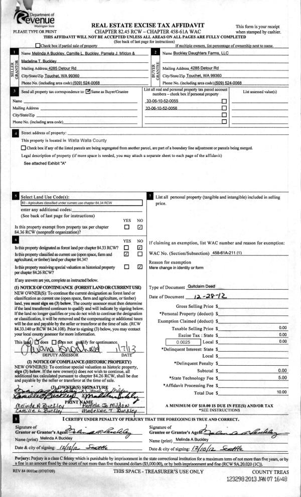 | 1 | 01/07/2013 | QCD | QUIT CLAIM DEED | BUCKLEY PAULINE ESTATE OF | BUCKLEY DAUGHTERS FARMS LLC | | | $0.00 | 123298 | 2013-00226 |