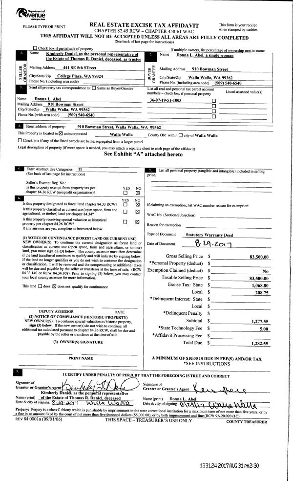 | 1 | 08/31/2017 | SWD | STATUTORY WARRANTY DEED | DANIEL THOMAS R ESTATE OF | ABEL DONNA L | | | $83,500.00 | 133124 | 2017-06850 |