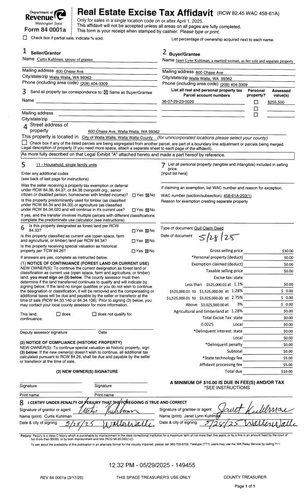 | 1 | 05/29/2025 | QCD | QUIT CLAIM DEED | KULHMAN CURTIS | KULHMAN JANET LYNN | | | $0.00 | 149455 | 2025-03003 |