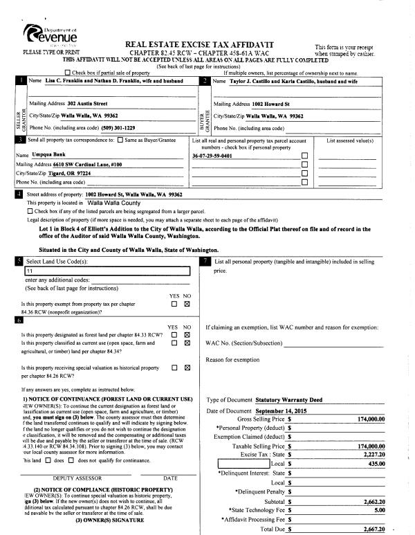 | 1 | 09/15/2015 | SWD | STATUTORY WARRANTY DEED | FRANKLIN NATHAN & LISA | CASTILLO TAYLOR J & KARLA | | | $174,000.00 | 128820 | 2015-08090 |