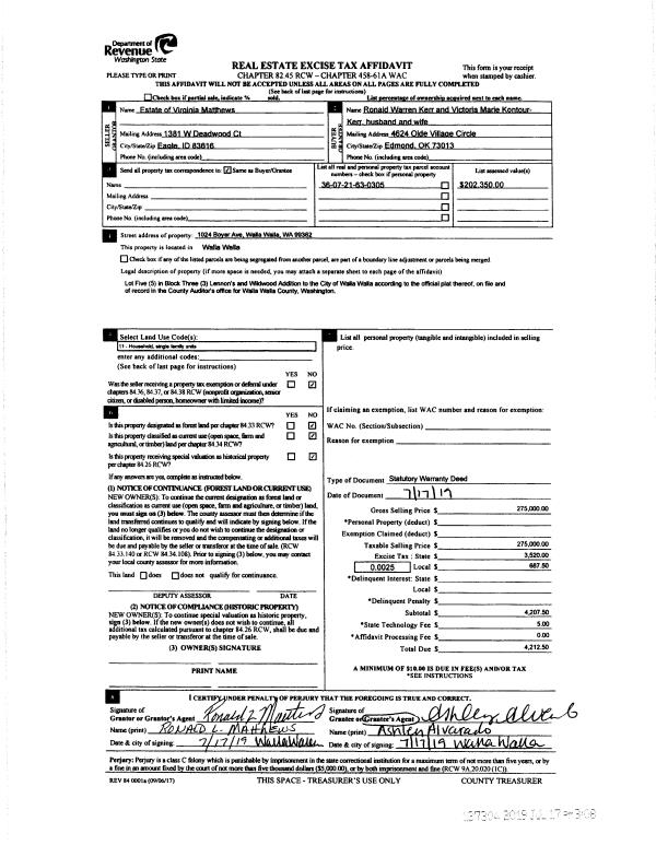 | 2 | 07/17/2019 | SWD | STATUTORY WARRANTY DEED | MATTHEWS VIRGINIA K ESTATE OF | KERR RONALD WARREN | | | $275,000.00 | 137304 | 2019-05199 |