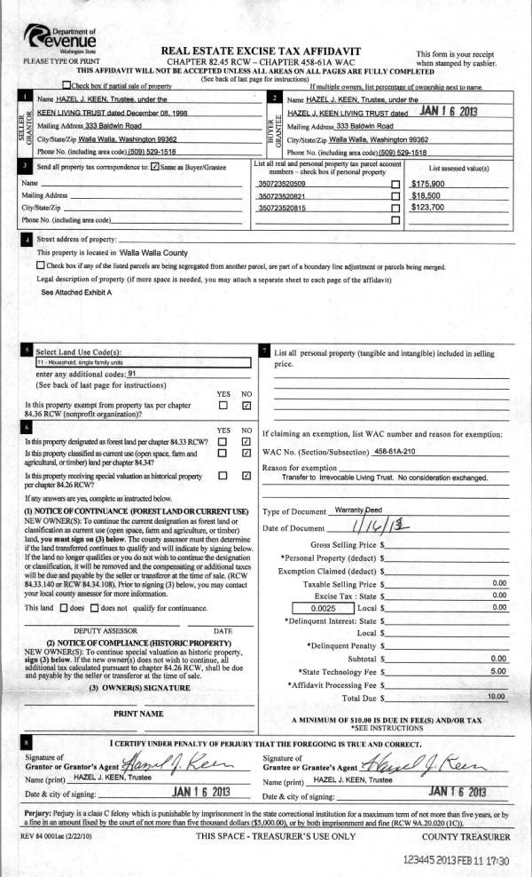| 2 | 02/12/2013 | WARRANTY D | WARRANTY DEED | KEEN LIVING TRUST | KEEN HAZEL J LIVING TRUST | | | $0.00 | 123445 | 2013-01250 |