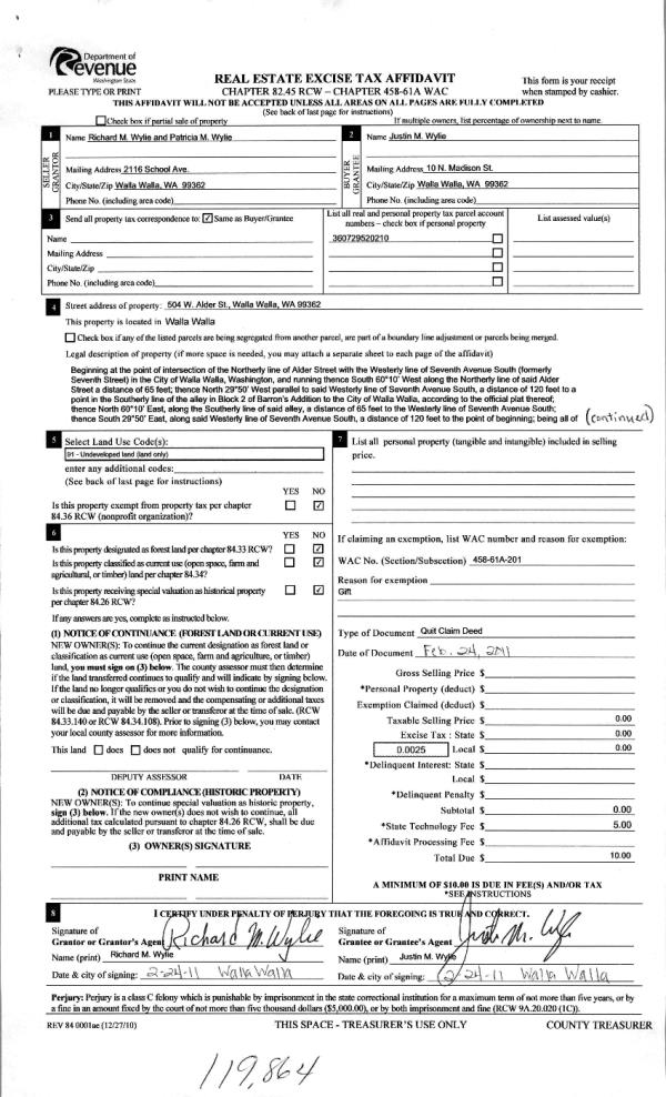 | 4 | 03/10/2011 | QCD | QUIT CLAIM DEED | WYLIE, RICHARD M & PATRICIA M | WYLIE, JUSTIN M | | | | 119864 | 2011-02182 |