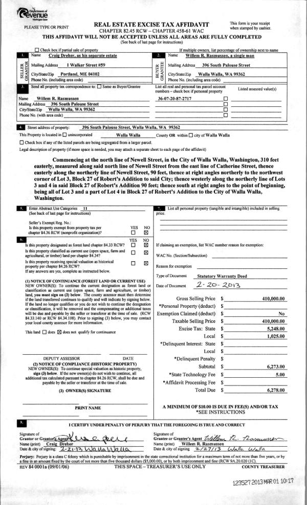 | 2 | 03/01/2013 | WARRANTY D | WARRANTY DEED | DREHER, CRAIG | RASMUSSEN, WILLEM R | | | $410,000.00 | 123527 | 2013-01855 |