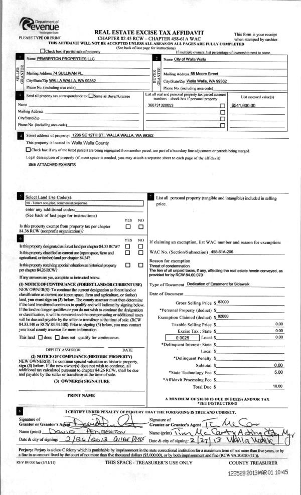 | 1 | 03/01/2013 | WARRANTY D | WARRANTY DEED | PEMBERTON PROPERTIES LLC | CITY OF WALLA WALLA | | | $0.00 | 123528 | 2013-01857 |