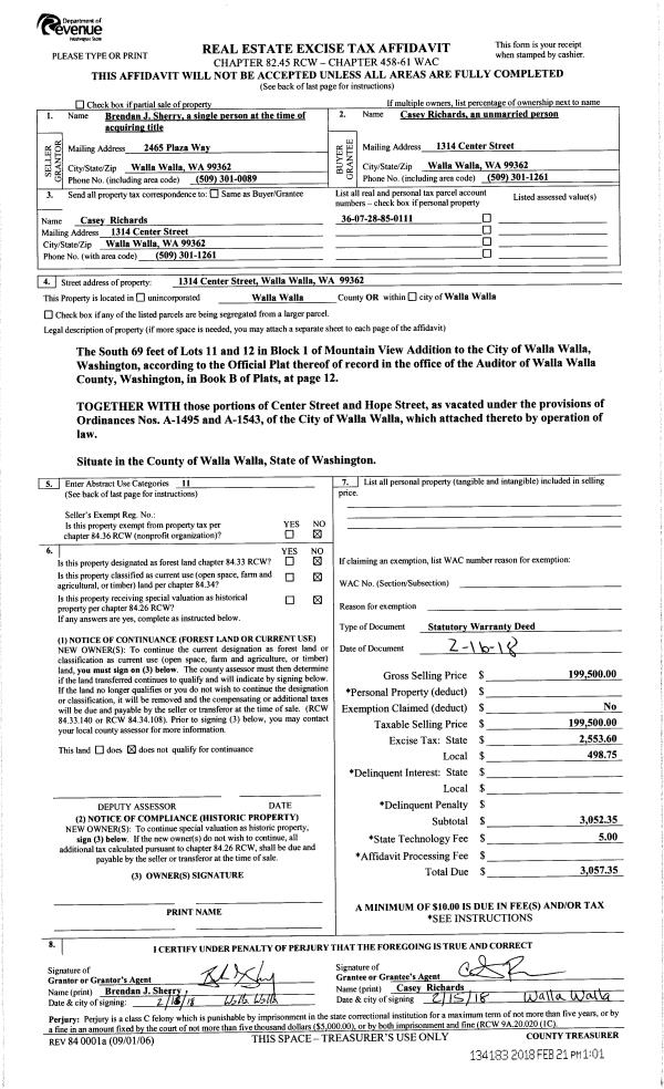 | 3 | 02/21/2018 | SWD | STATUTORY WARRANTY DEED | SHERRY BRENDAN J | RICHARDS CASEY | | | $199,500.00 | 134183 | 2018-01431 |