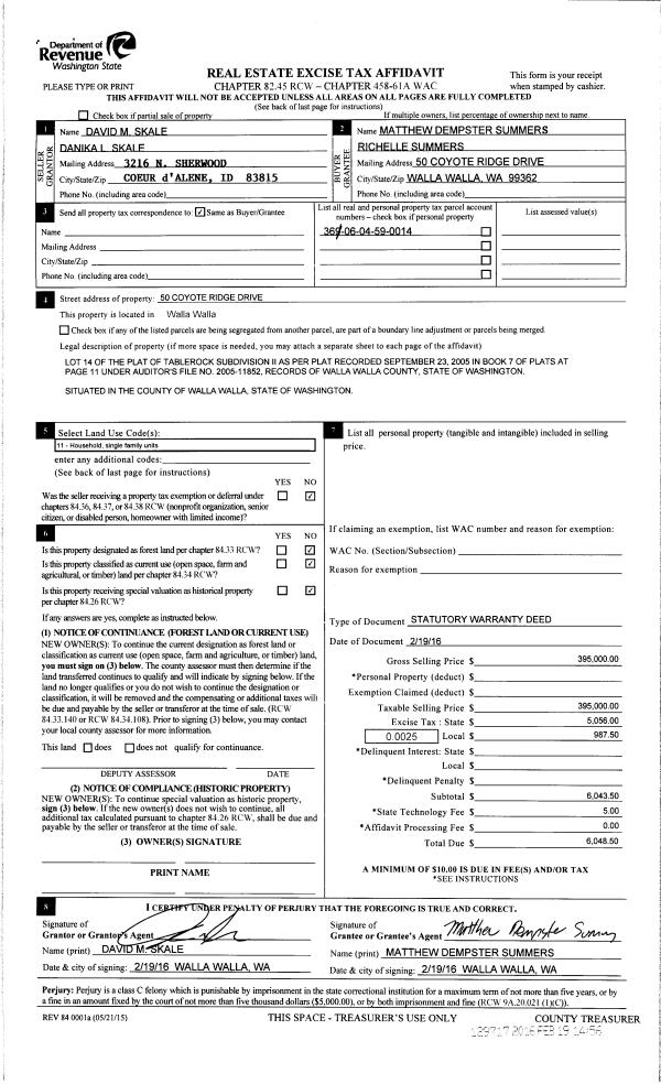 | 1 | 02/19/2016 | SWD | STATUTORY WARRANTY DEED | SKALE DAVID M & DANIKA L | SUMMERS MATTHEW DEMPSTER & RICHELLE | | | $395,000.00 | 129717 | 2016-01258 |