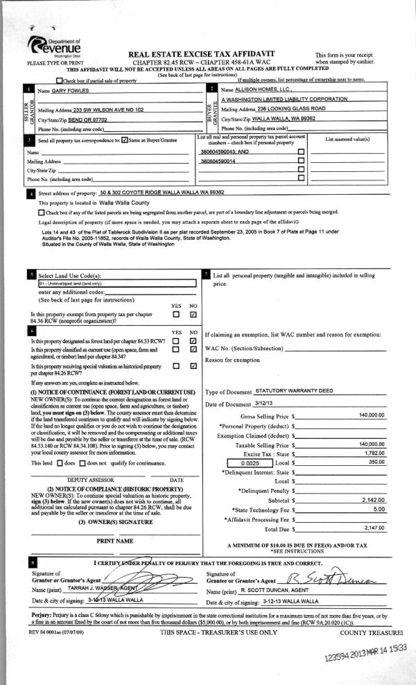 | 4 | 03/14/2013 | WARRANTY D | WARRANTY DEED | FOWLES, GARY L | ALLISON HOMES LLC | | | $140,000.00 | 123594 | 2013-02389 |