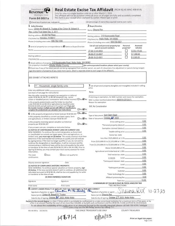| 2 | 10/30/2023 | QCD | QUIT CLAIM DEED | BIDWELL CLINTON M III REV LV TRUST | REX SHAUNA | | | | 146714 | 2023-06366 |