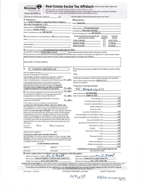 | 1 | 06/03/2024 | QCD | QUIT CLAIM DEED | BIDWELL CLINTON M III REV LV TRUST | REX SHAUNA | | | | 147639 | 2024-02916 |
